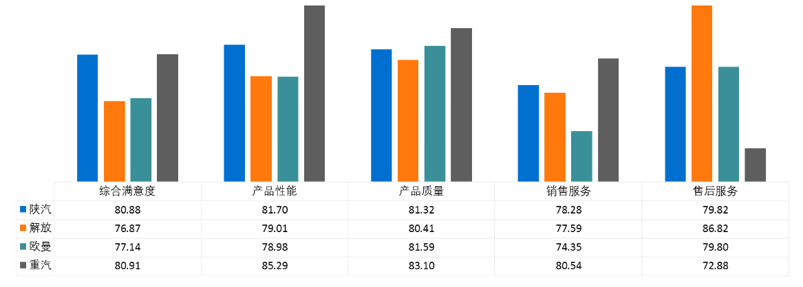 在全國專用市場中,四大品牌的顧客滿意度測評指數(shù)可劃分兩個(gè)梯隊(duì):